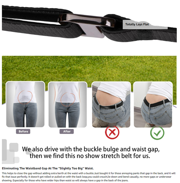 • ☘ Flat buckle--- The flat buckle is not like a bulky buckle, it lays flat so that it’s no show when you wear a tighter-fitting top. Just put the clasp into the belt end hole and you’ll get a perfect no show flat buckle belt for your pants.