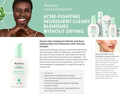 - The Aveeno Clear Complexion collection is designed to clear skin without dulling your natural glow. Each exclusive soy-enriched skincare product, with clinically proven acne medication, clears blemishes and helps reveal your skin's true radiance