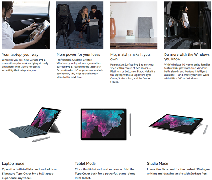Unplug. Pack light. Get productive your way, all day. Collaborate on projects, perfect a presentation, manage email, and stream a show when it's all done. From office to home, airport to open road, power your life on the move with new Surface Pro 6, the laptop that adapts to you - now more powerful than ever with the latest 8th Generation Intel Core processor for faster, smoother multitasking. Wireless - Wi-Fi - IEEE 802.11 a/b/g/n/ac compatible, Bluetooth Wireless 4.1 technology.