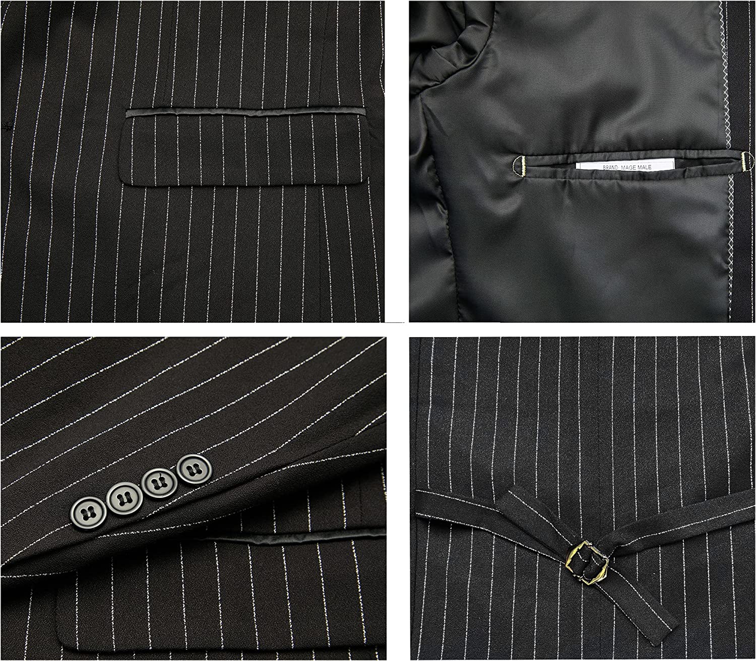 Button Fly closure, slim fit notch lapel flap pocket. Premium center vent two-button single breasted stripe suit jacket with matched four-button vest with back adjustable belt for better fit and classic trousers.