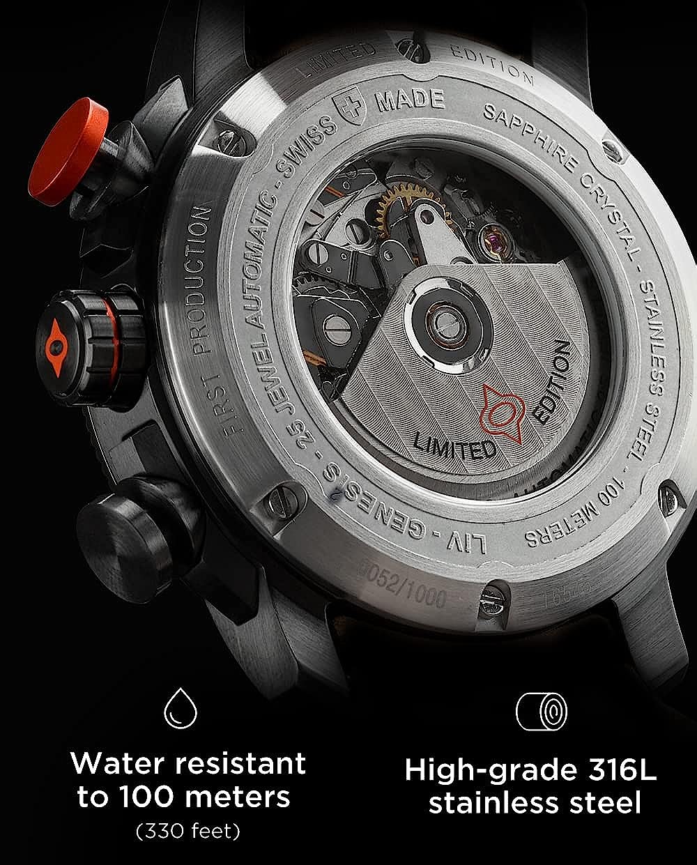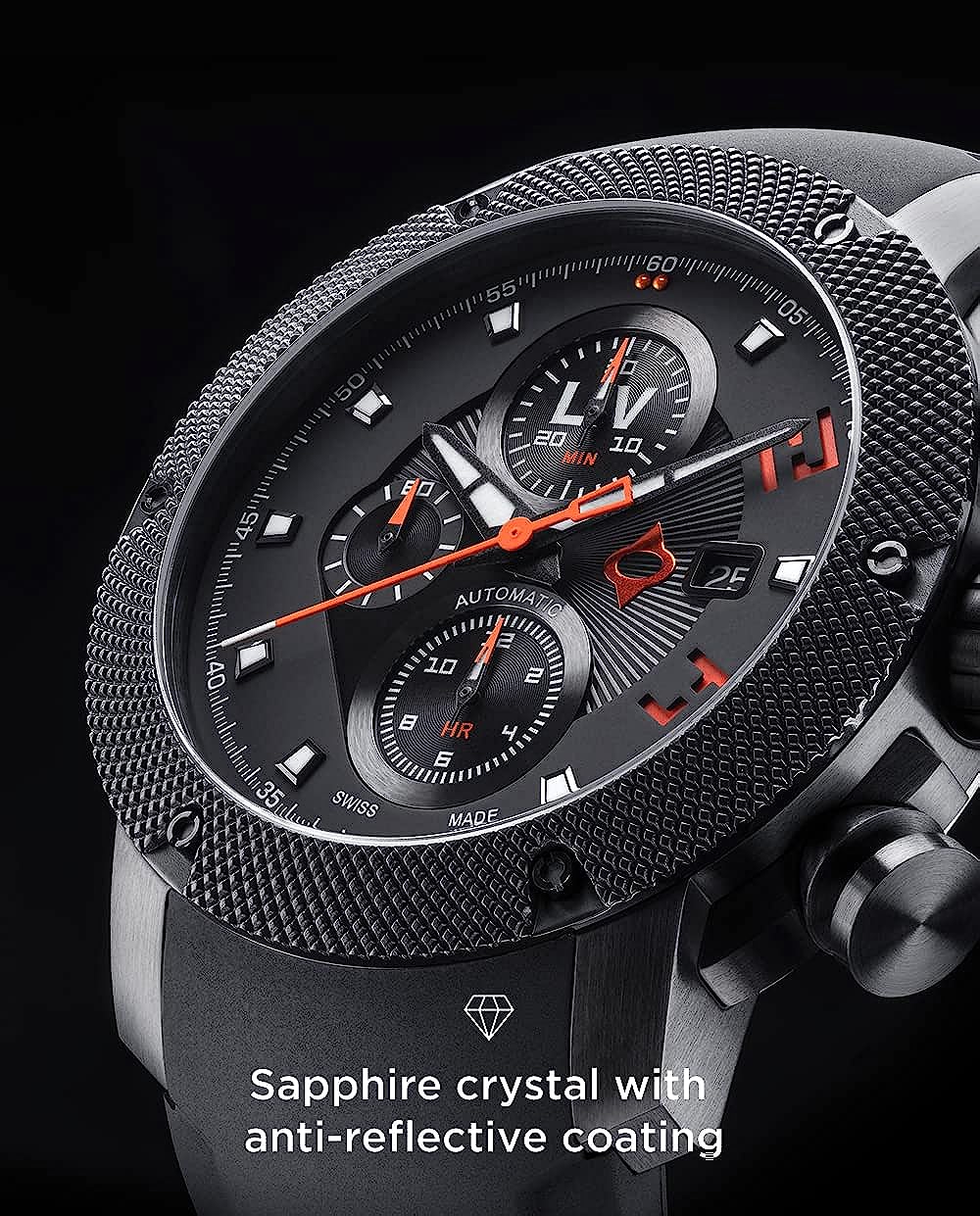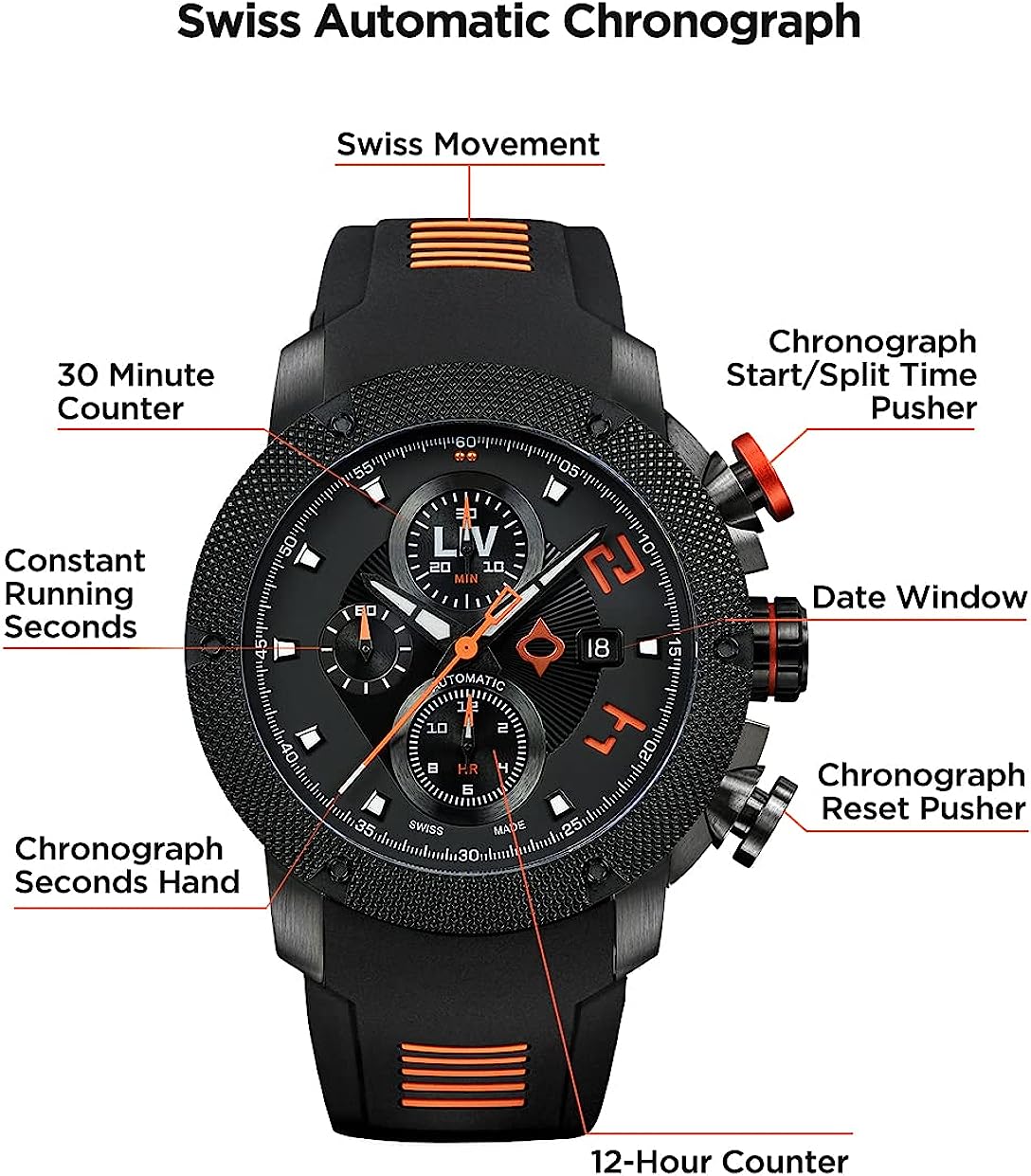 LIV GX-AC Swiss Automatic ETA 7750 26 Jewel Movement Chronograph 46mm 316L Case, 3D Multi-Layer Dial + Quickset Date - Rugged Classic Watch for Men - Skeleton Case-back - Sapphire Crystal - 330 FT Wat