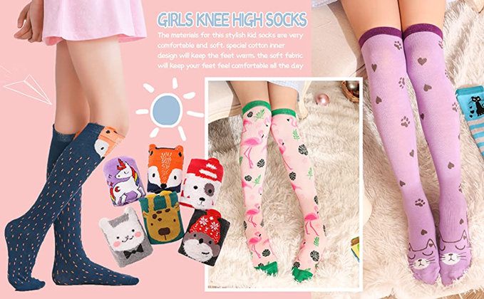 CUTE AND SWEET DESIGN : Cute long socks for girls keep your girls warm with fashion look. Patterns like unicorn, cat, flamingo, fox, dog, panda, bear are all included. Attractive design will brighten up normal daily life for every special you. These nice girls boot socks always keep your toes completely dry and comfortable.