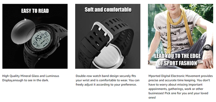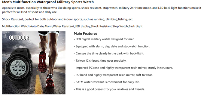 • Mens watch: Appeals to mens, especially to those who like doing sports, shock resistant, stop watch, military 24H time mode, and LED back light functions make it perfect for all kind of sport and daily use