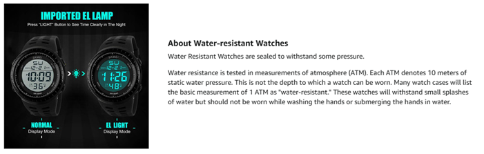 Water resistance is tested in measurements of atmosphere (ATM).Each ATM denotes 10 meters of static water pressure.This is not the depth to which a watch can be worn. Many watch cases will list the basic measurement of 1 ATM as "water-resistant."These watches will withstand small splashes of water but should not be worn while washing the hands or submerging the hands in water.