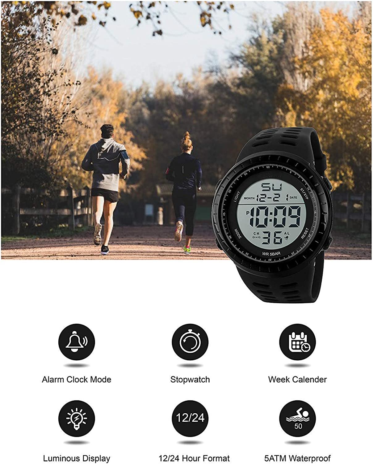 • Digital watch: Hourly time, Date/Week, Luminous, Stopwatch(1/100 seconds), Alarm, 12/24 hour formart. Use import EL Lamp, Press"LIGHT"button to see the time clearly in the light, easy to read.
