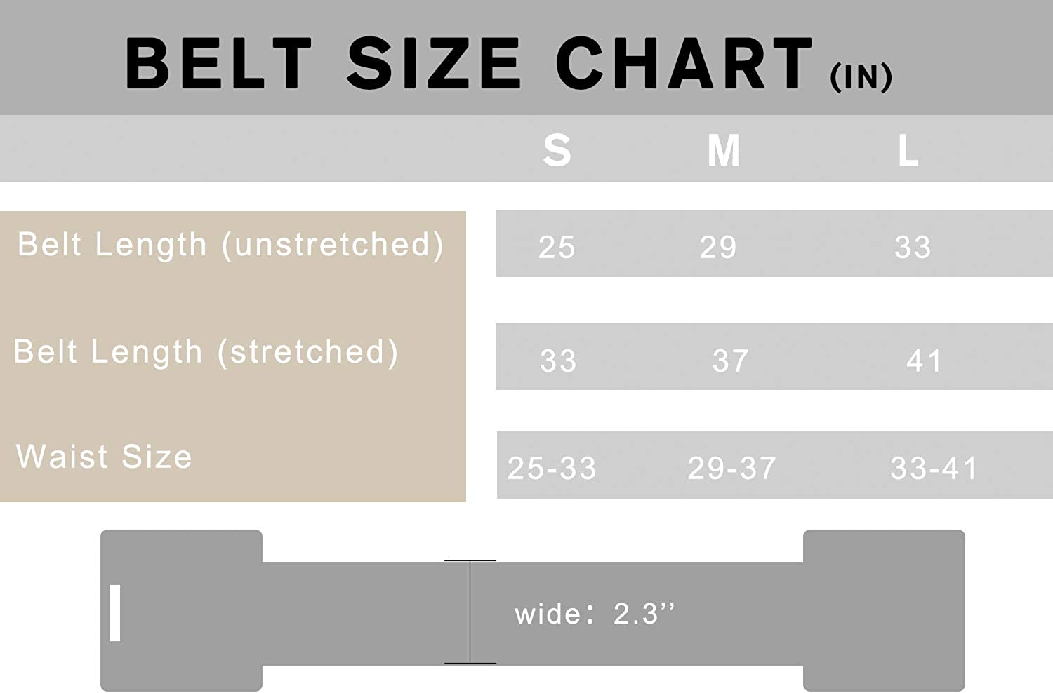 • Belt length: 25"(64cm) when relaxed, can stretch to 33"(85cm); Belt width: 2.3"(6cm); Buckle size:6.5"*3"(16.5cm*7.5cm)