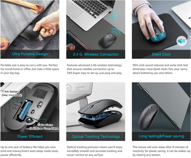 【STABLE CONNECTION AND POWER EFFICIENT】The 2.4 GHz wireless mouse provides a powerful, reliable connection, effective up to 10 meters of range. This mouse will auto sleep after 8 minutes of inactivity for power saving, it can be waken up by clicking any button. 1 AA battery needed (not included in the package).