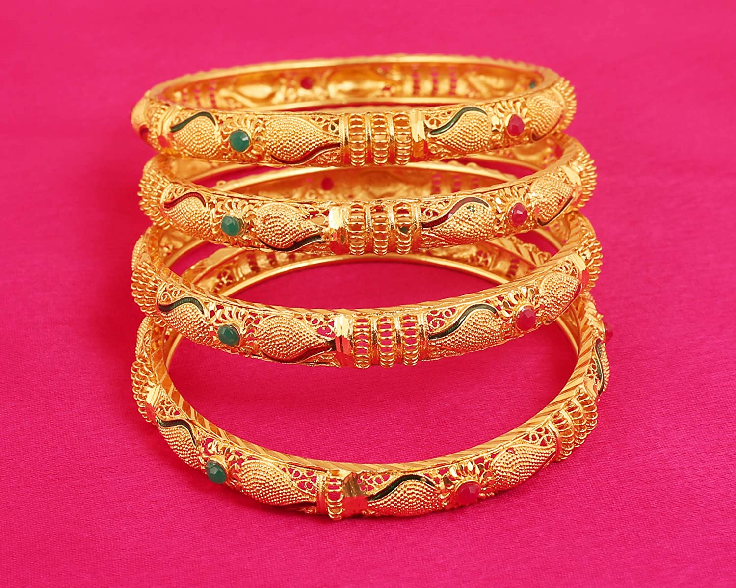 NEW Touchstone "Golden Bangle Collection" Indian Bollywood Desire Beautifully Carved Conch Shell Inspired Faux Ruby Emerald Meena Designer Jewelry Bangle Bracelets. Set of 4. In Gold Tone For Women SIZE : LARGE. Indian Size 2-10. Inner Diameter 2.625 Inches or 6.67 cm. Please check against old Bangle before ordering to avoid disappointment