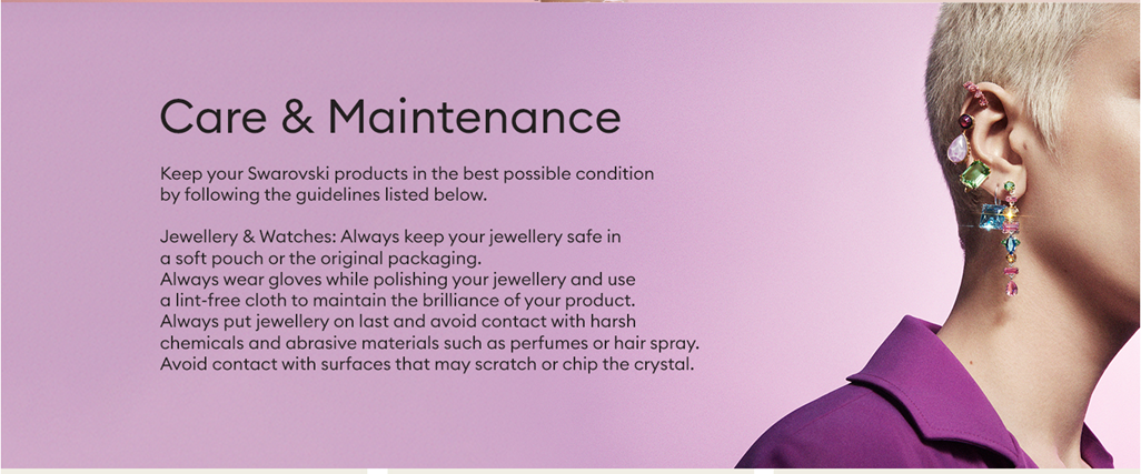 Designed to last: Swarovski jewelry will maintain its brilliance over time when simple care practices are observed; remove before contact with water, lotions or perfumes to extend your jewelry's life
