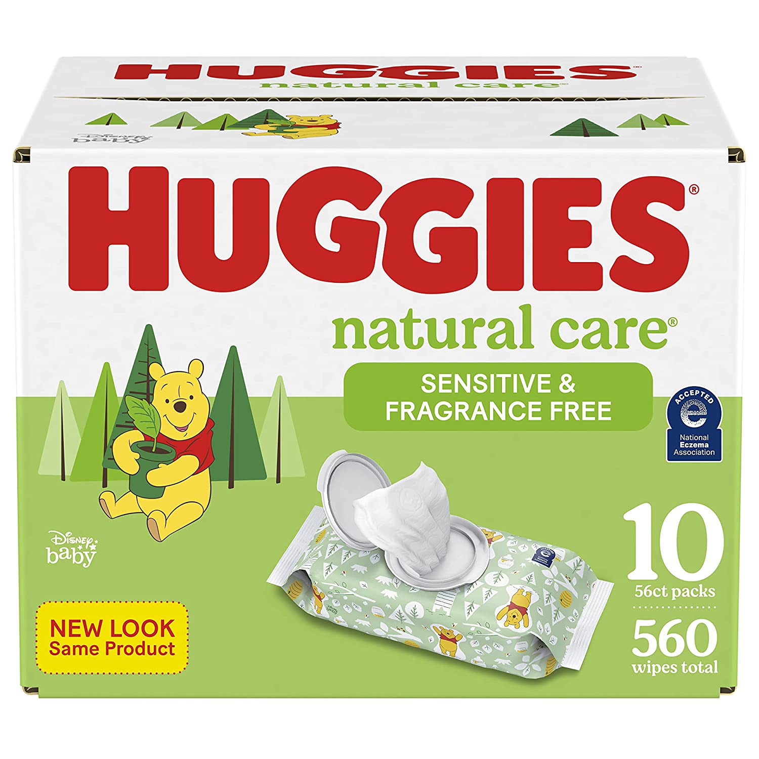 • 10 flip-top packs of 56 Huggies Natural Care Sensitive Baby Wipes, Unscented (560 wipes total), the same baby wipes you love, now with brand new Winnie-The-Pooh designs