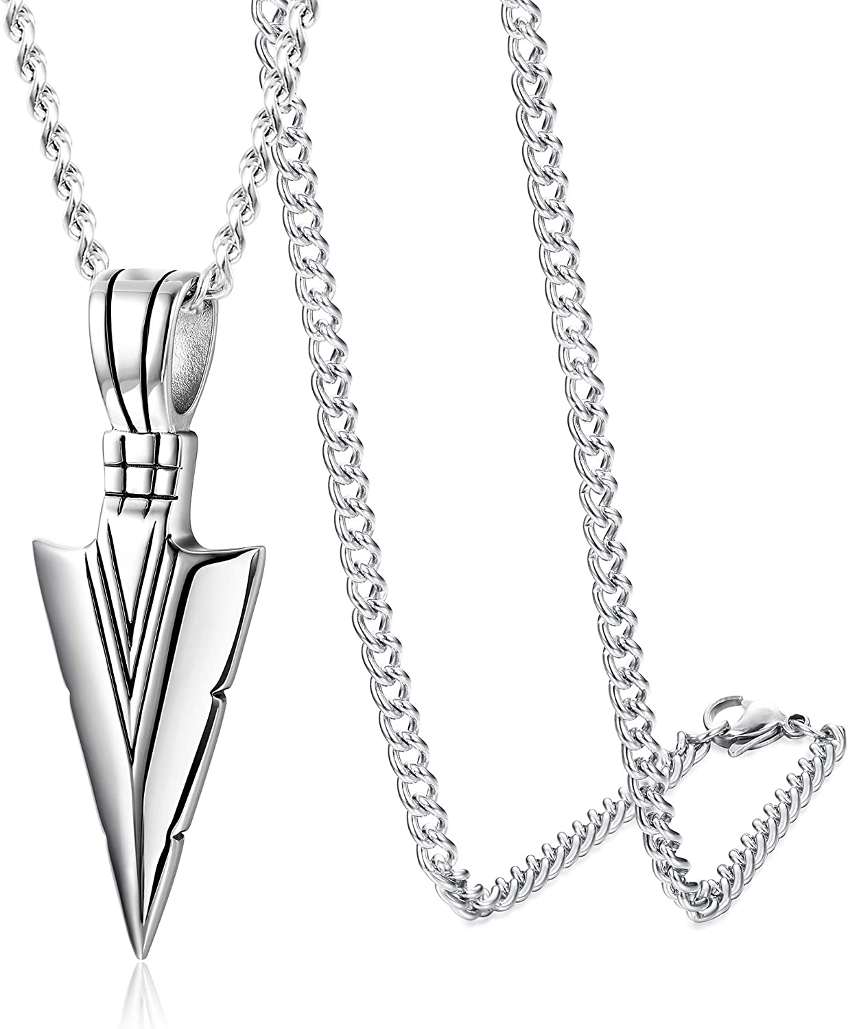 NECKLACE DIMENSION-- 2Pcs Necklace Are In Same Size, Arrowhead Pendant: 0.66*2.2"(17mm*56mm), Come With 2Pcs 24Inches Sturdy Curb Chains, Best Length As Necklace; Color: Silver Tone/Black Tone; Good Weight To Hang On Your Neck, Definitely Would Be Nice For Anyone!