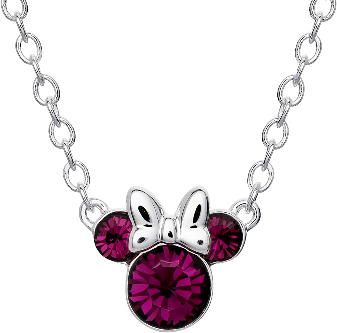 Officially Licensed Disney Jewelry: Silver plated Minnie Mouse pendant necklace featuring the instantly recognizable Minnie icon adorned with gleaming Amethyst Purple Crystals (February)