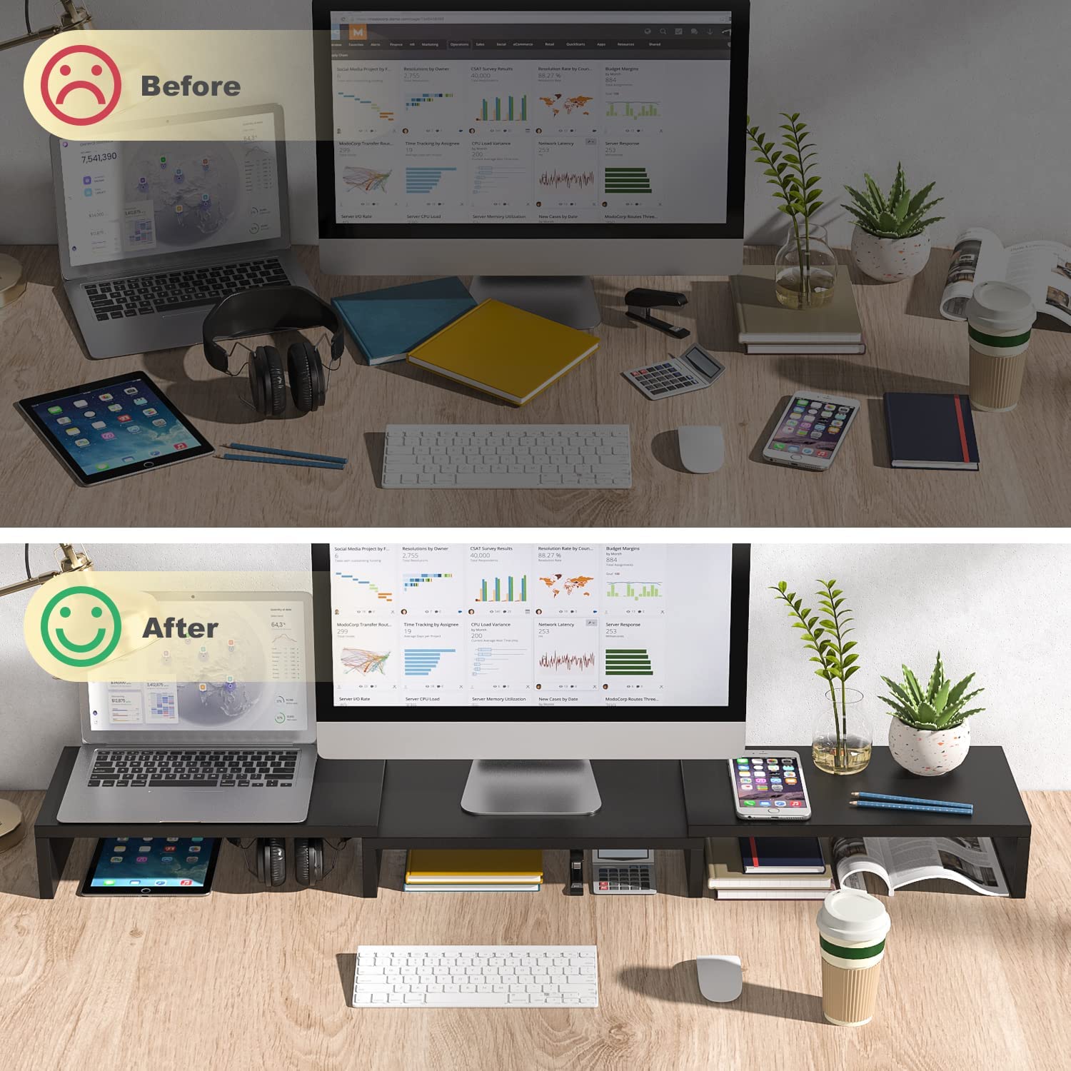 【Customizable 3 Shelf Design】Featuring adjustable length (33-48.2 inch) and angle, this desk computer stand riser can be place on a corner desk or in a straight-line, table like setup, which supports 2-3 monitors while offering enough space underneath for smaller desk essentials, or to tuck your keyboard and mouse away.