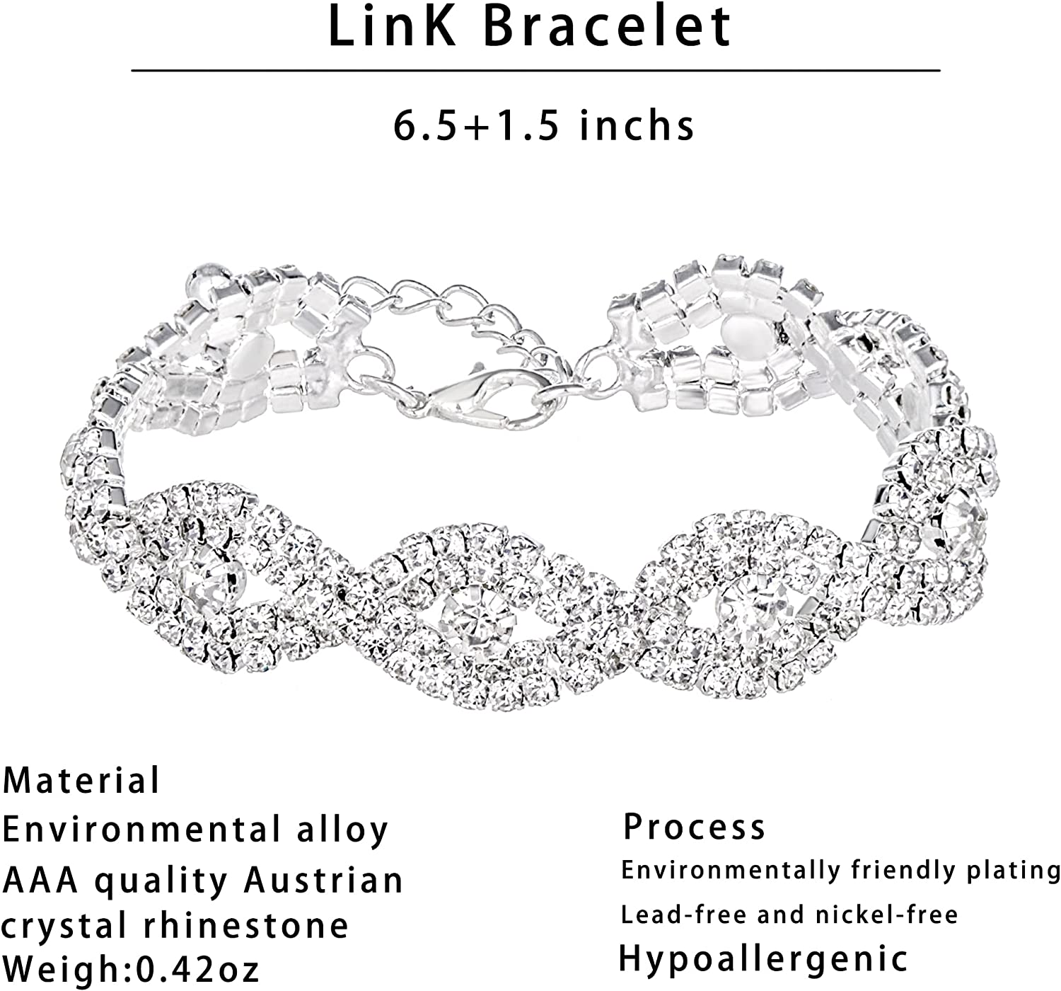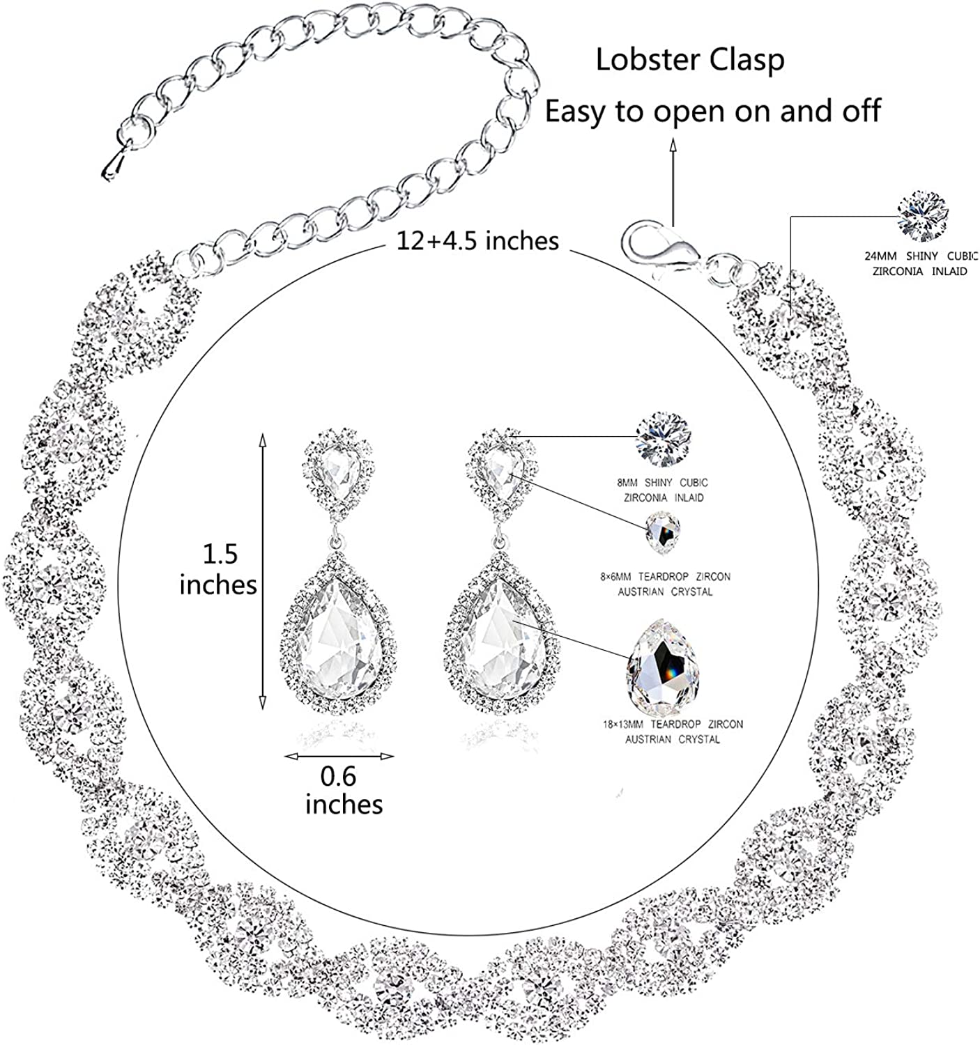 • ❤ Specification ❤: Size: Necklace: 12 inches + 4.5 inches extension. Link Bracelet: 6.5 inches + 1.5 inches extension. Dangle Earring 1Set. Lobster Clasp: Easy to open and close,not easy to fall off (More security). Color: silver eco-friendly plating, Measure up of Prop 65 standard,Will not tarnish and hurt your neck. Material: AAA Rhinestone & Crystal + alloy.