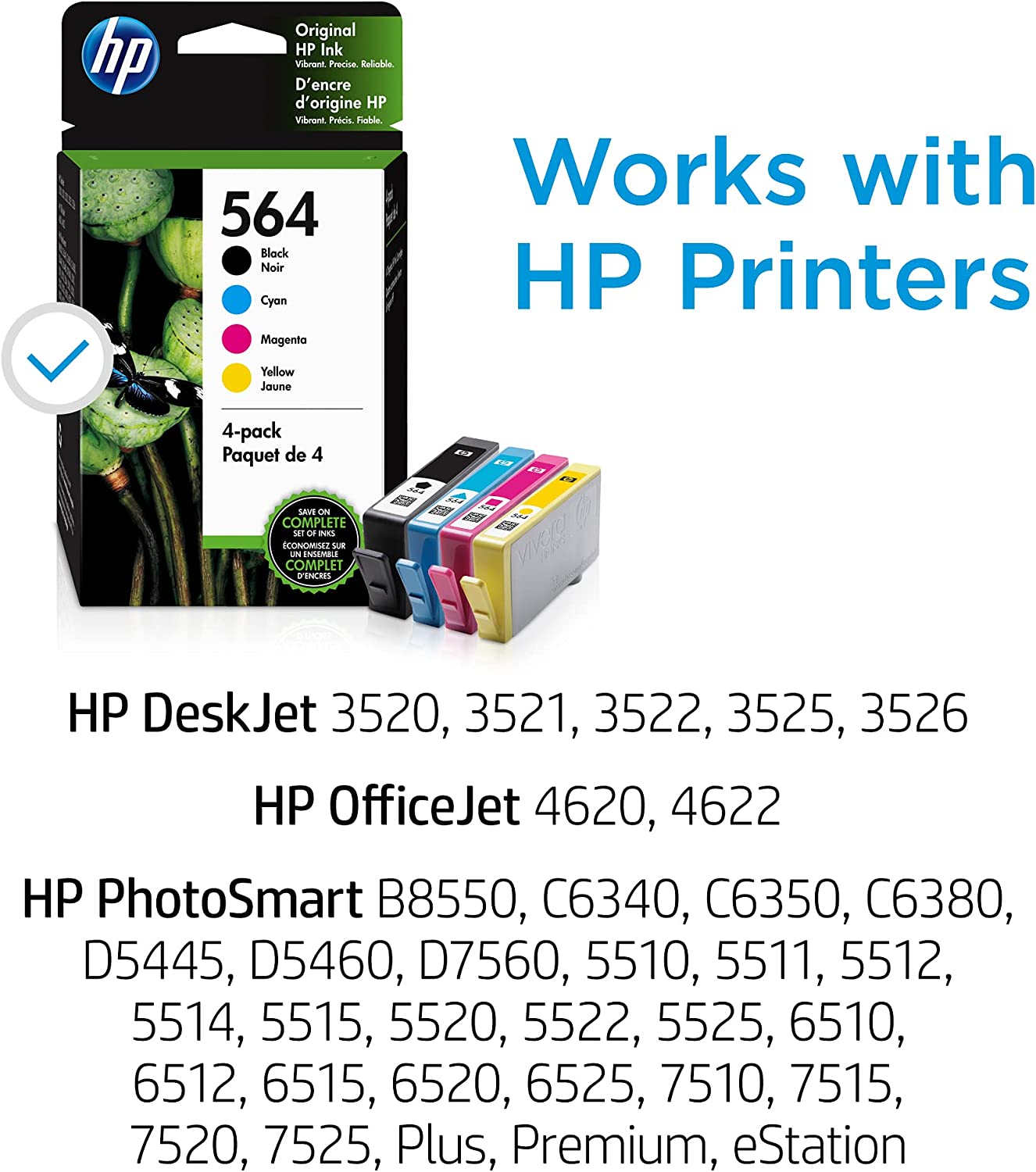 - What's in the box: 4 new Original HP 564 Ink Cartridges — 1 black, 1 cyan, 1 magenta, 1 yellow (3YQ22AN)