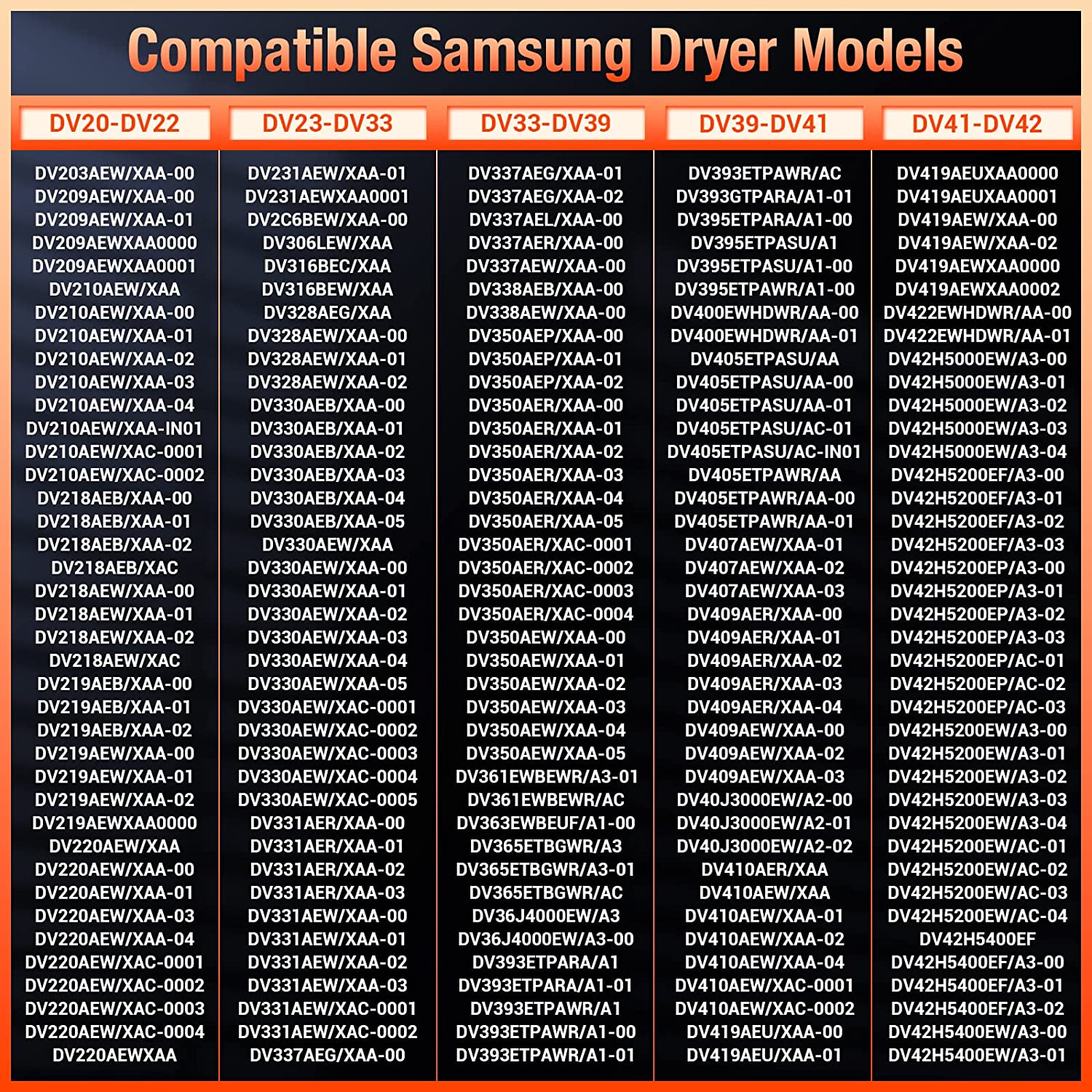 - Compatible Dryer Models: Azdele Samsung dryer heating element fits for dv42h5000ew/a3,dv45h7000ew/a2 dv48h7400ew/a2,dv42h5200ep/a3,dv40j3000ew/a2,dv42h5200ew/a3,dve50m7450w/a3,dv448aep/xaa,dv5451aew/xaa,dv42h5000es,dv331aer/xaa,dv5471aep/xaa,dv56h9000ep/a2,dv448aew/xaa,dv331aew/xaa,dv419aew/xaa,dv50f9a6evw/a2,dv50f9a7evp/a2,dv361ewbewr/a3,dv393etpawr/a1,dv407aew/xaa,dv45h7000ep/a3, etc. It's also suitable for brands like LG, Maytag, Sears, Kenmore, Kitchen-Aid and Roper.