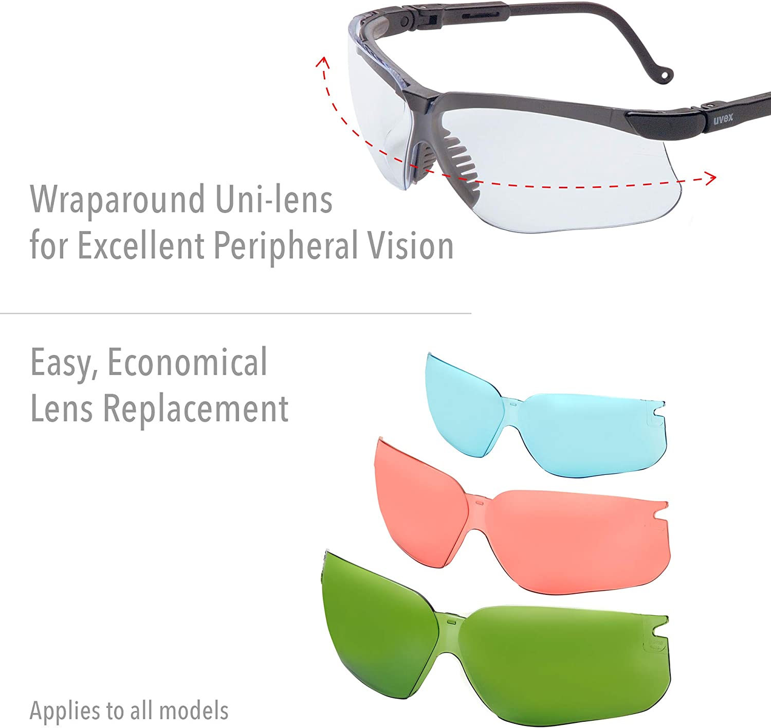 Uvex Genesis Safety Glasses are engineered for comfort, protection and style, Our Genesis line is the number one selling premium protective eyewear in the market, delivering an incredible range of superior product benefits. Built with MMT (Multi-Material Technology), these safety glasses offer the highest available impact safety: military V0 ballistic test protection against impact energies 7X higher than ANSI requirements (on select tints). They are also certified to meet CSA Z94.3 standards. Some models also feature an advanced TPE frame formulation that performs exceptionally well in environments where chemical mist, cutting oils and high moisture are present. The wraparound 9-base uni-lens offers excellent side coverage and peripheral vision, and the adjustable temple length & lens inclination makes for a truly customized fit. Unique comfort features include a soft elastomer browguard to diffuse impacts, and soft, flexible nose fingers that reduce slippage and conform to almost any nasal profile. A ventilation channel between the frame and lens vents the eye socket area to deliver an outstanding level of moisture and fog control. Genesis safety eyewear also boasts an easy and economical lens replacement system to extend the life of your glasses. Uvex Genesis Safety Glasses are available with multiple lens tints to suit almost any work environment. Uvex stands for "Ultra Violet Excluded", which means our safety glasses employ specifically formulated resins that filter 99.9% of the UV radiation in accordance to the U6 scale of the Z87 standard. Uvex has also developed Spectrum Control Technology (SCT), which incorporates unique dyes designed to absorb select wavelengths of radiant energy (light). Our anti-glare glasses, tinted safety glasses and safety sunglasses are designed to manipulate light to reduce a spectral hazard, or to provide distinctive filtration for specific safety eyewear viewing tasks. Examples include filtering solar radiation to reduce glare, and blocking radiation from welding to protect workers around these operations. Multiple anti-fog and anti-scratch coatings are also available. The new HydroShield technology provides our best anti-fog lens coating, keeping your vision clear up to 90X longer than most other competitive anti-fog safety glasses. The Uvextreme anti-fog coating offers great, dual-action performance under demanding hot and humid conditions for long lasting fog-free performance. Our Ultra-Dura hardcoat makes for some of the toughest scratch-resistant safety glasses in the world. Permanently bonded to the lens, it offers unparalleled scratch and chemical resistance. The dual anti-fog/anti-scratch Dura-Streme coating combines the benefits of our industry-leading Uvextreme anti-fog coating and our Ultra-Dura anti-scratch hardcoat. While the advanced anti-fog properties of Uvextreme help keep the interior of the lens clear from fogging, the rugged properties of Ultra-Dura protect the exterior of the lens from scuffs and scratches, adding up to three times more life to lenses.