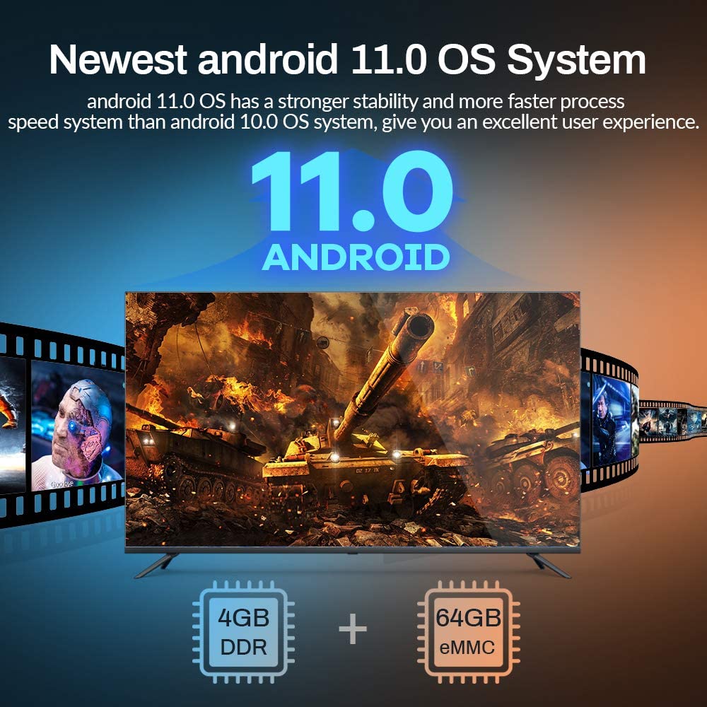 【Newest Android 11.0 OS】The android tv box equipped with Latest Android 11.0 OS in the market, powered by RK3318 Quad core cortex-A53 Ultra high frequence CPU, which makes sure the android box running stable and smooth to load movies, pictures and games without buffer. More smoothly than previous 9.0 and 8.1 OS. Privacy protection, totally new UI designed,and can update online directly.