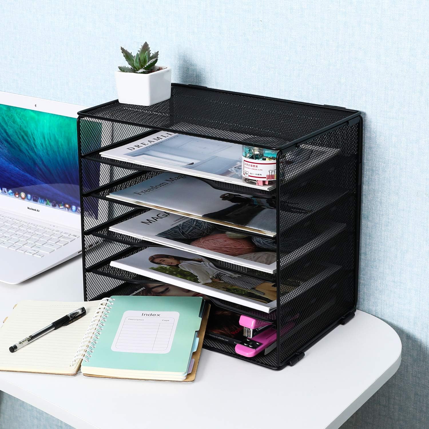 Mesh construction desk file organizer, open design lets you see inside the organizer to identify the contents of each compartment quickly,features 5 tiers of storage horizontal slots for mail, forms, catalogs, invoices, papers, bills and other supplies; compartments are designed to accommodate paper sizes up to 9 x 13 inch