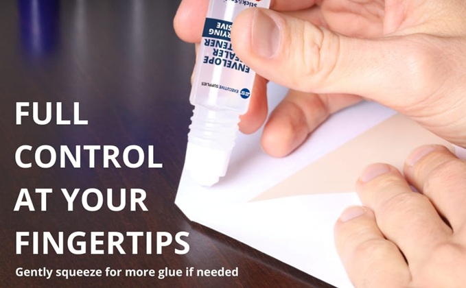 USER FRIENDLY: Our envelope softener roller features a sturdy spill-proof plastic bottle that resist cracking, this helps prevent unwanted leaks! The cool part is that it is transparent and perfectly reveals adhesive level. Thanks to its compact size, this envelope adhesive seal conveniently fits in the palm, allowing you to maintain a secure and comfortable grip to get an accurate and super-fast seal!!