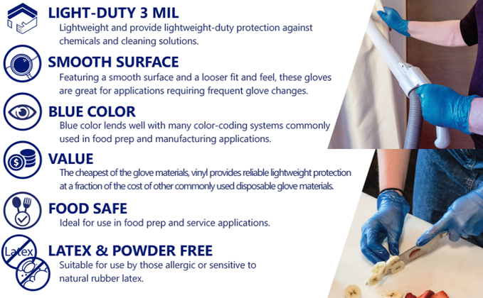 LIGHT-DUTY PROTECTION: Constructed from 3-mil PVC, our vinyl gloves deliver reliable barrier protection against many common cleaning solutions & chemicals. Best for short-duration & light-duty tasks.