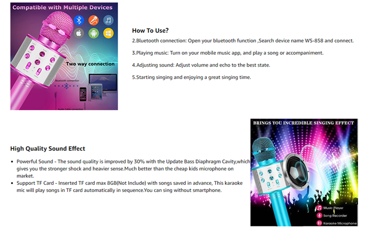 • ♪【Top Sound Quality & Fun Voice Change】- Professional audio processor and tuning system, three layers high destiny noise reduction, Creating a stunning KTV live-sound environment and wonderful echo reverberation.Change your voice with 5 different effects,Provide much more fun to your kids.