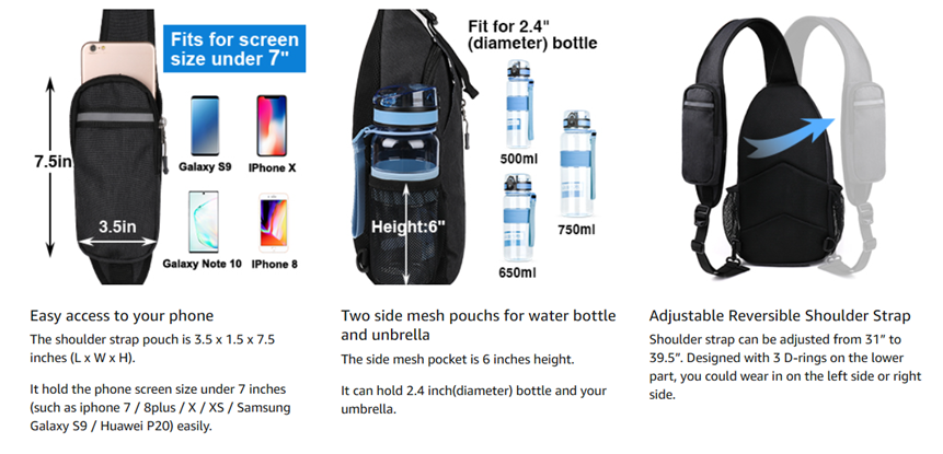 • Keep Everything in Order: Size: 7 x 3.5 x 15 inches /18 x 9 x 38 cm. The front zipper bag and buckle bag allow you to store iPad mini, iPhone 7 Plus, power band, etc., with several separate small compartments inside, it can effectively keep your small items like makeup, tissue, keys and so on. The side mesh pocket is 6 inches height, it can hold 2.4 inch(diameter) bottle.