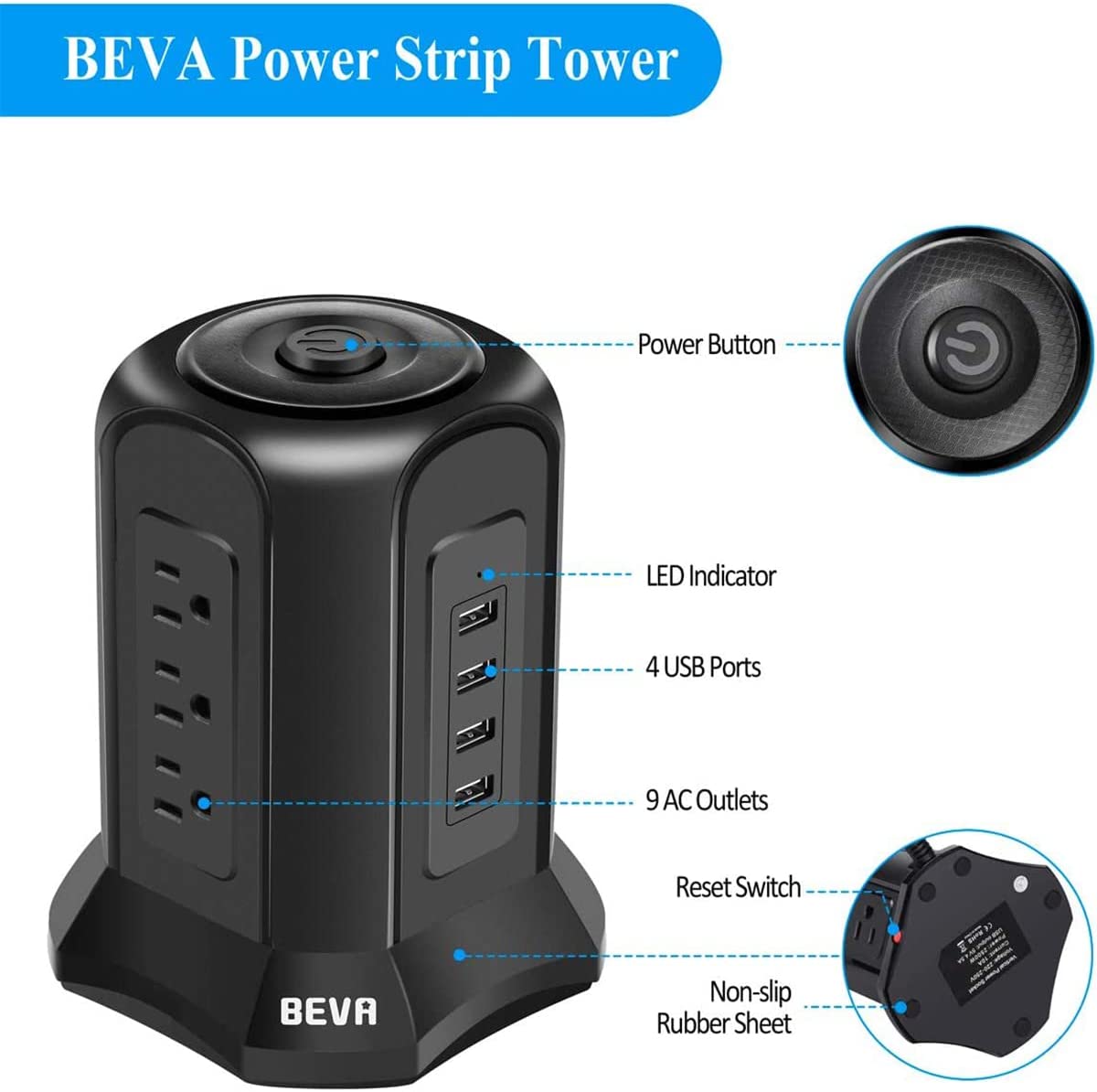 Power Strip Tower Surge Protector BEVA 10ft Flat Plug Desktop Charging Station 9 AC Outlets 4 USB Ports, 900 Joules, Long Extension Cord for Home Office Appliances Smartphones Computer Tablets(Black)