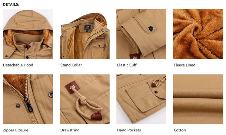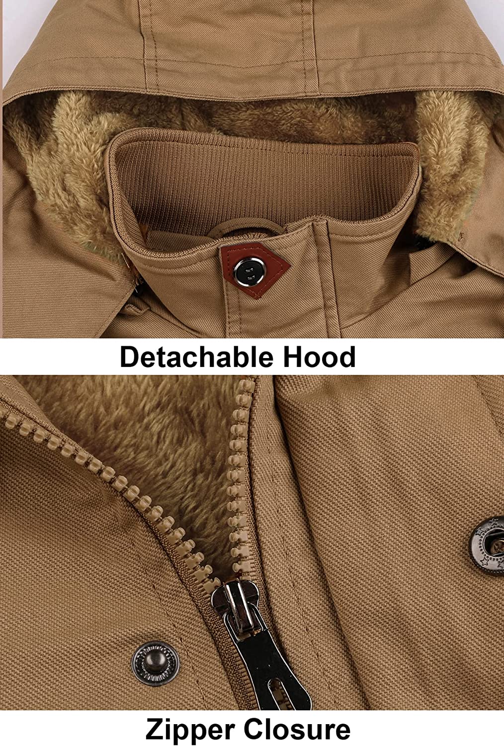 Design: Detachable Hood with Drawstring and Snap Button, Effective Wind Protection and Keep Warm.