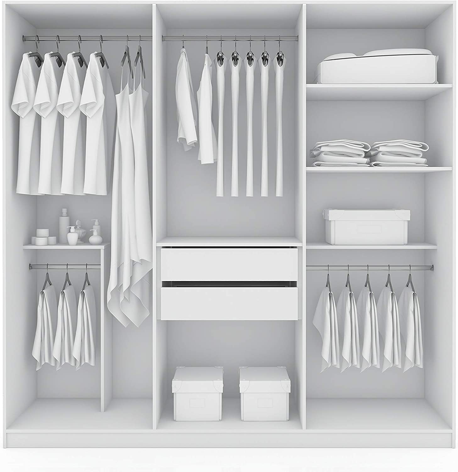 Features Very Ample Storage with Rods for Short and Long Clothes, Plus Shelves and Center Drawers. Store Your Entire Wardrobe Inside.