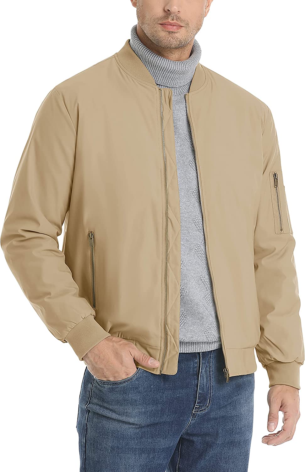 STYLE: Long Sleeve Zipper Up Bomber Jacket, Brass Zippers Give a Classic Military Look.