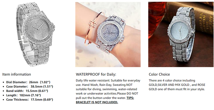 Crystal diamonds quartz women watch round dial with featuring hour marks, provide precise time keeping. Imported quartz movement, analog display with simple dial,easy to read. Luxury fashion style, very comfortable to wear.Key scratch resistant watch face made of high hardness glass. Suitable for any parties and common life for women to show your style.