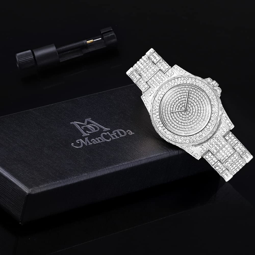 ManChDa Diamond Watch Silver Watch for Women Men Rhinestone Watches Ice Out Watch Full Diamonds Watch Quartz Crystal Stainless Steel Gold Watch Women Men Wrist Watch