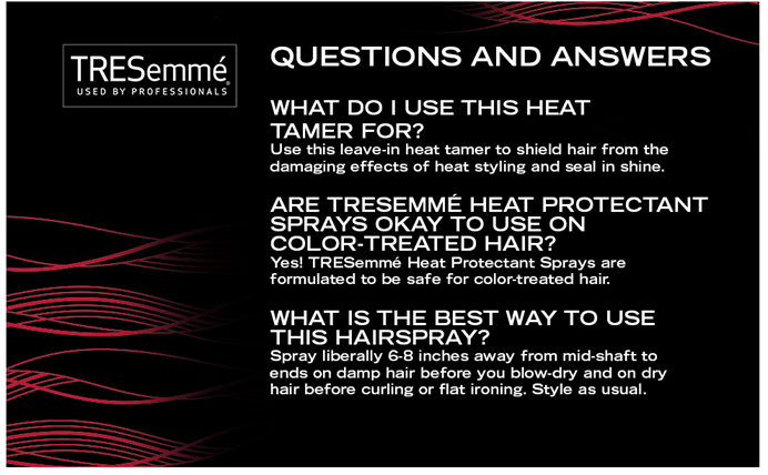 Most of us are guilty of going straight for our heat styling tools, but eventually, that heat causes split ends and dry hair. So, before you heat style, you need a hair protectant spray to prep and protect your locks. Use TRESemmé Protecting Heat Spray for a finished look that's shiny and undeniably soft. Would you ever grab a hot pan without oven mitts? No. And when heat appliances like flat iron spray and curling irons can reach up to 450°F, you should never use them on your hair without a heat protectant spray for hair either. Our TRESemme Heat Protection is a hair heat protectant designed to enhance hair's flexibility to re-form and hold its shape without getting damaged for ultimate hair heat protection. It's perfect hair protection from heat for those of us who love to style but need to restore vibrancy and shine to dried-out, damaged hair. How to use: Spray this heat protection spray on your hair liberally 6-8 inches away, from mid-shaft to ends, on both damp hair before you blow-dry and dry hair before curling or flat ironing. TRESemmé is an industry leader in providing you with salon-ready hair quality products.
