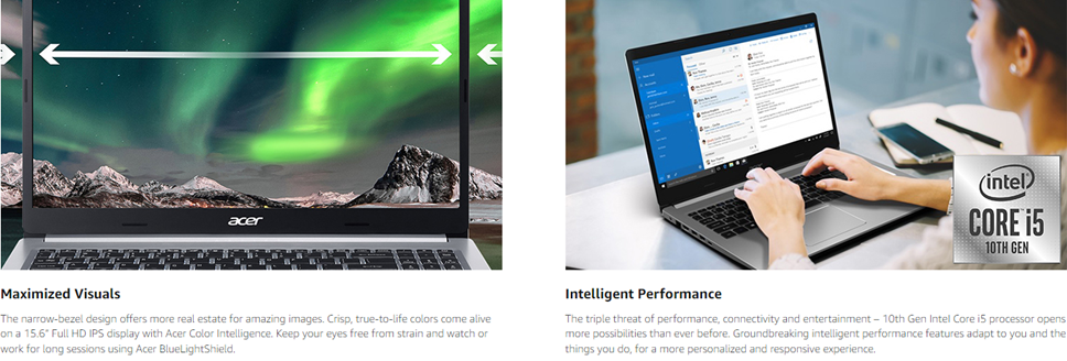 Acer Aspire 5 A515-54-59W2 comes with these high level specs 10th Generation Intel Core i5-10210U Processor 1 6GHz with Turbo Boost Technology up to 4 2GHz (6MB Smart Cache) Windows 10 Home 15 6" Full HD (1920 x 1080) widescreen LED-backlit IPS Display Intel UHD Graphics 620 8GB DDR4 Memory 256GB PCIe NVMe SSD True Harmony Technology Two Built-in Stereo Speakers Acer Purified Voice Technology with Two Built-in Microphones Acer Fingerprint Reader supporting Windows Hello Intel Wireless Wi-Fi 6 AX201 802 11ax Dual-Band 2 4GHz and 5GHz featuring 2x2 MU-MIMO technology (Max Speed up to 2 4Gbps) 10/100/1000 Gigabit Ethernet LAN (RJ-45 port) Bluetooth 4 2 Back-lit Keyboard HD Webcam (1280 x 720) 1 - USB 3 1 (Type-C) port (Gen 1 up to 5 Gbps) 2 - USB 3 1 Gen 1 Port (one with Power-off Charging) 1 - USB 2 0 Port 1 - HDMI Port with HDCP support Lithium-Ion Battery Up to 9 5-hours Battery Life 3 97 lbs | 1 8 kg (system unit only) (NX HN3AA 003).