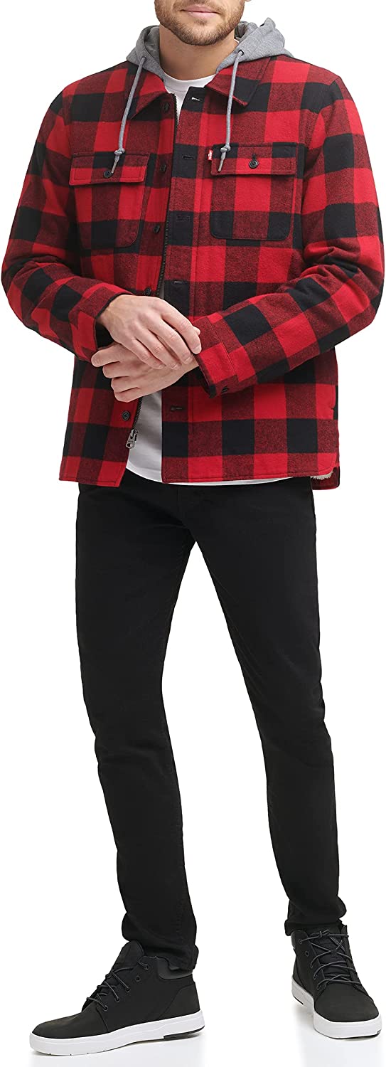 This classic shirt jacket provides you with comfort and style. The full Sherpa lining and jersey hood add extra warmth for chilly fall evenings.