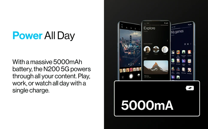 - Large 5000mAh battery - The OnePlus Nord N200 5G is powered by a massive 5000mAh battery, providing all the power required to get you through the day. Watch hours of TV, play graphically intense games, or browse the internet non-stop without fear of your device dying.