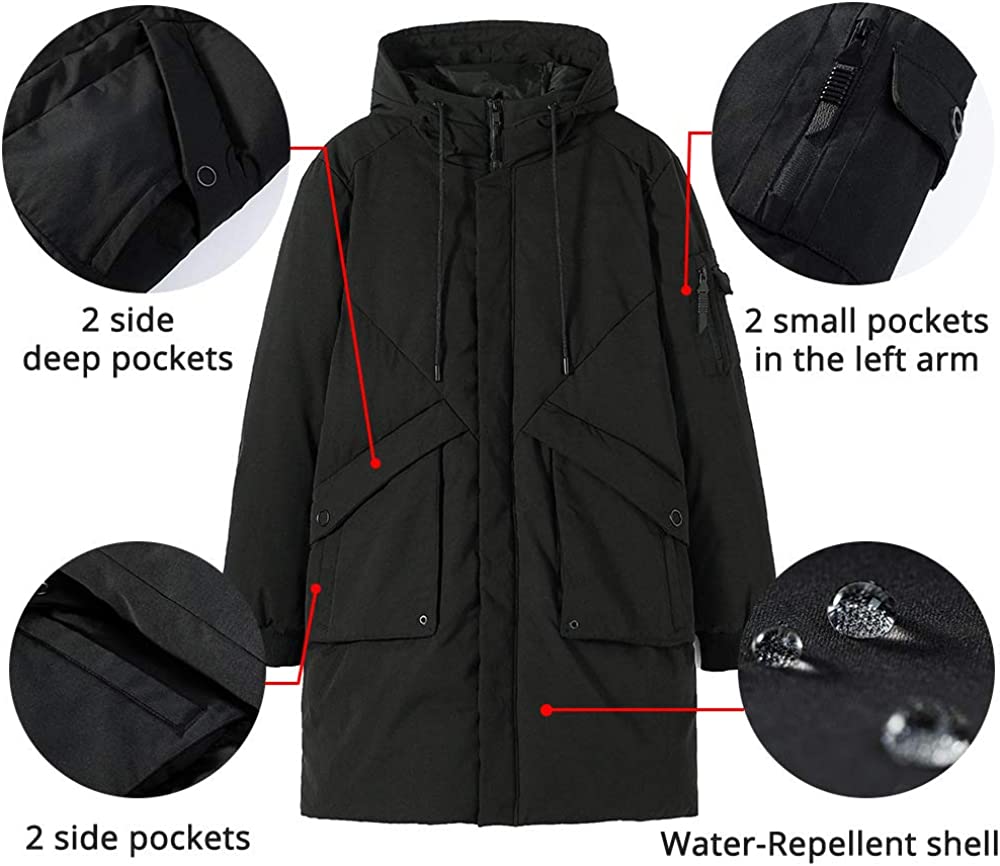 DESIGN 1: Water-Repellent shell fights bad rainy or misty weather, keep your body dry and warm; down cotton quilted filling provides perfect warmth and comfort in cold fall and winter; total 7 pockets, 2 deep pockets and 1 inner pocket with zipper to keep personal stuff safe, 2 side pockets to keep hands warm, 2 small pockets in the left arm make it more fashional; hooded design with Drawstring prevents cold air
