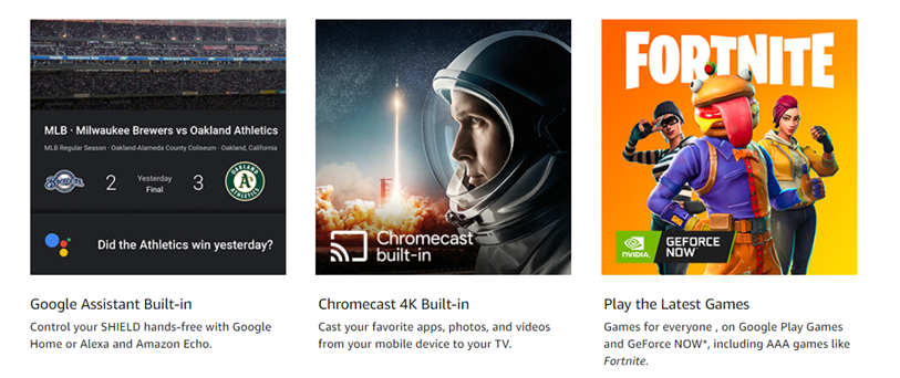 - Voice Control. The built-in Google Assistant is at your command. See photos, live camera feeds, weather, sports scores, and more on the big screen. Dim the lights and immerse yourself in your favorite show or music using only your voice. And control your SHIELD hands-free with Google Home or Alexa and Amazon Echo. Format/Container support: Xvid/ DivX/ASF/AVI/MKV/MOV/M2TS/MPEG-TS/MP4/WEB-M