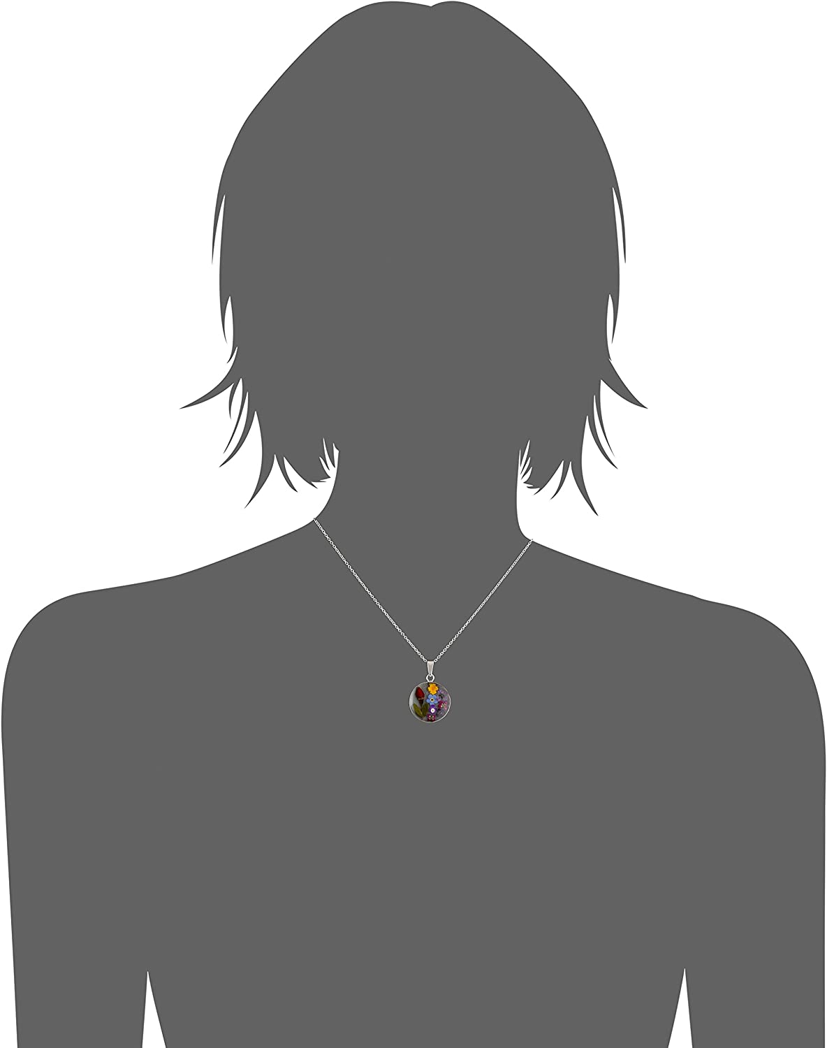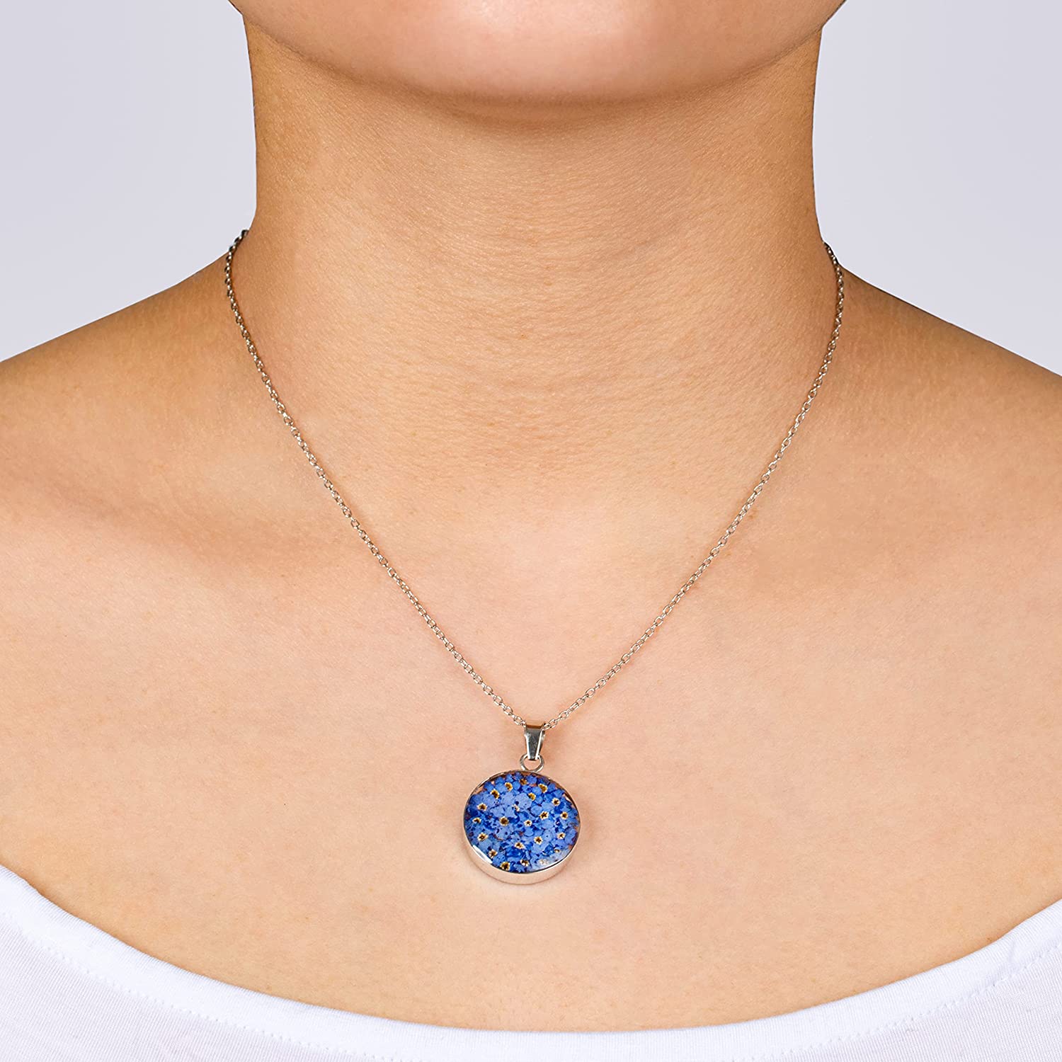 Sterling silver necklace featuring round pendant with blue pressed flowers