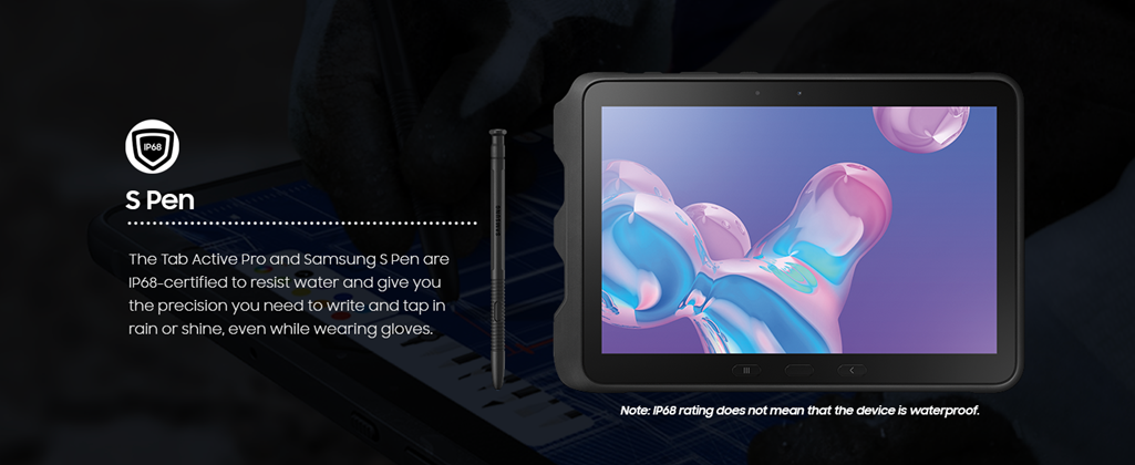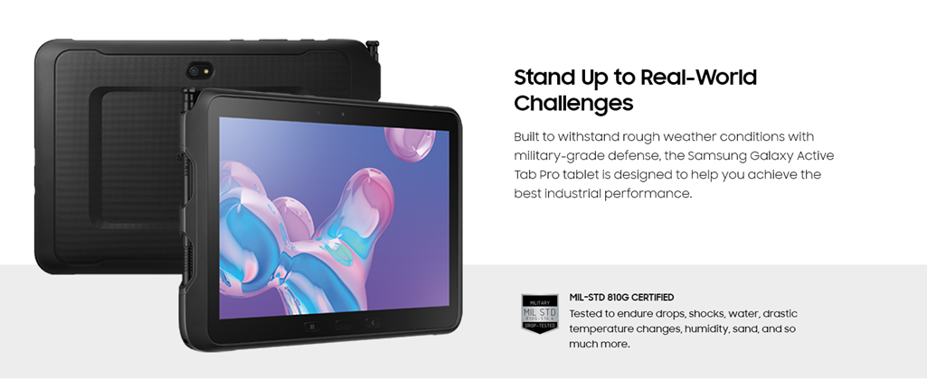 Built to withstand rough weather conditions with military-grade defense, the Samsung Galaxy Tab Active Pro tablet is designed to help you achieve the best industrial performance. The Galaxy Tab Active Pro is MIL-STD-810G and IP68-certified - tough enough.