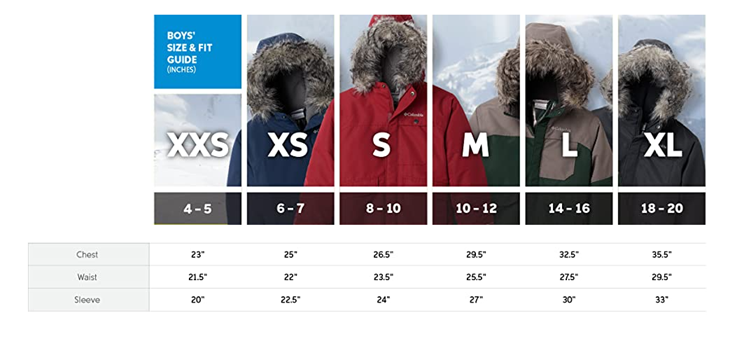 Built to take the elements in stride, this jacket seals out moisture and cold, while keeping just the right amount of heat in. Plus, it features Columbia's Outgrown system of extendable cuffs, so it’s sure to be a favorite for seasons to come. This is one tech-loaded youth-sized snow jacket that's ready for action. He’s bound to love the sherpa-lined hood with removable cozy faux fur trim. It includes adjustable cuffs, super convenient dual-entry hand pockets, a chest pocket, and drop tail to keep the elements away. A jacket fit for adventure with our Outgrown system to ensure many seasons of wear. This winter jacket is offered in multiple sizes and colors. Regular Fit. To ensure the size you choose is right, utilize our sizing chart and the following measurement instructions: For the sleeves, start at the center back of your neck and measure across the shoulder and down to the sleeve. If you come up with a partial number, round up to the next even number. For the chest, measure at the fullest part of the chest, under the armpits and over the shoulder blades, keeping the tape measure firm and level.