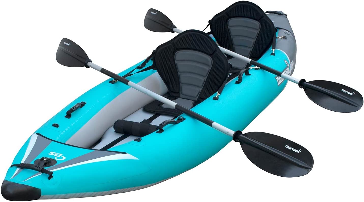 Paddle and ConquerThe Driftsun Rover 220 Tandem Inflatable Kayak is an adventure ready kayak for families and thrill seekers alike. This versatile two person kayak preforms exceptionally well in both flat and rough water. This package combines the highest quality materials, workmanship and top-notch accessories at an unbeatable price. Driftsun Inflatable Kayaks were born on the lakes and rivers of Northern California. Thoughtfully designed, constructed and tested by a team that lives to paddle.