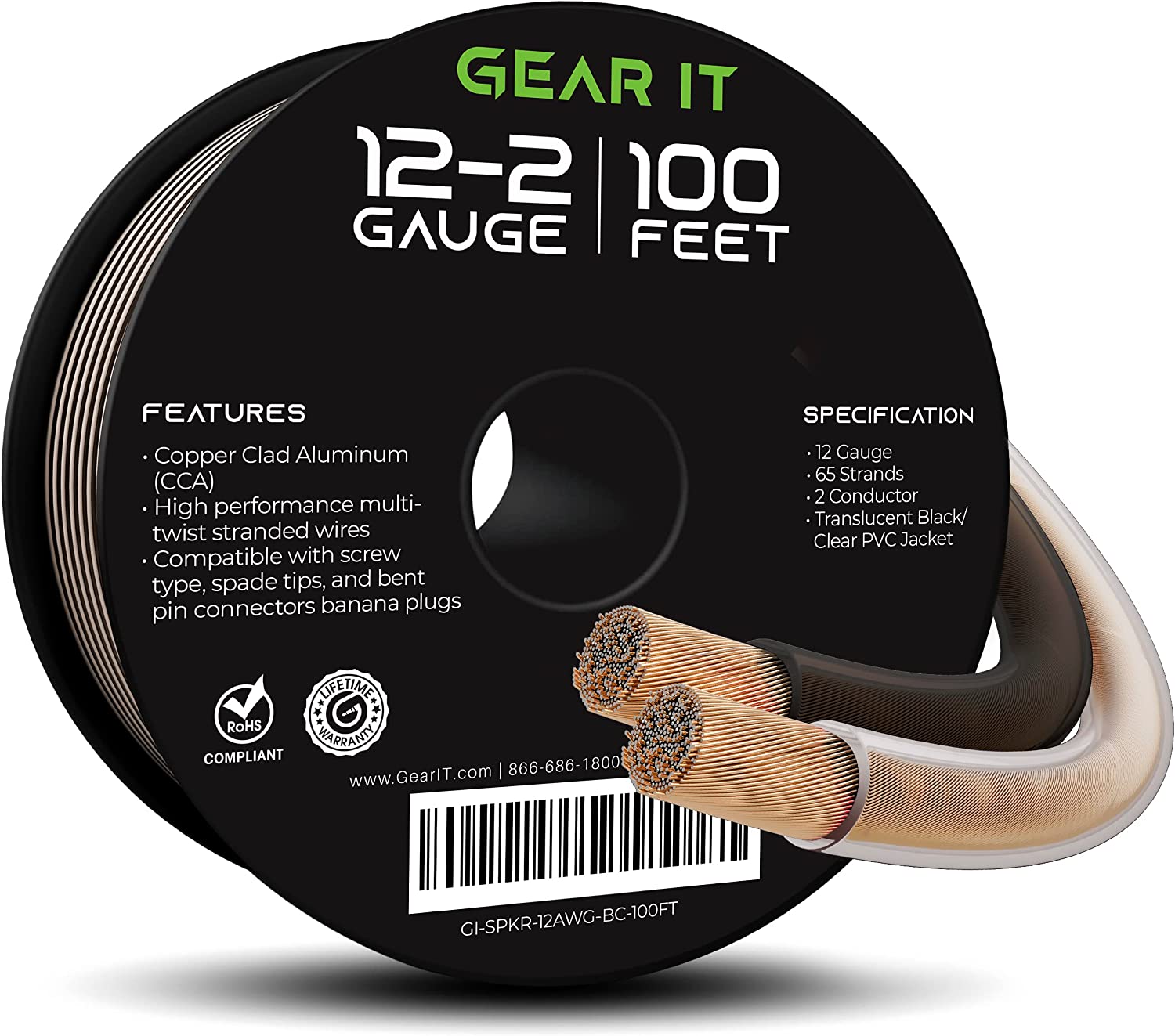 GearIT Pro Series 12AWG Speaker Wire, 12 Gauge Speaker Wire Cable (100 Feet / 30 Meters) Great Use for Home Theater Speakers and Car Speakers, Transparent Black/Clear
