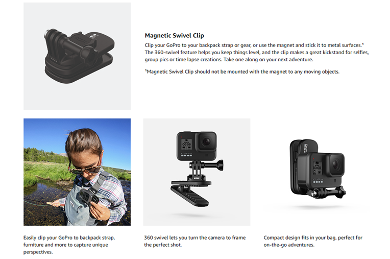 Clip your GoPro to your backpack strap or gear, or use the magnet and stick it to metal surfaces. The 360-swivel feature helps you keep things level, and the clip makes a great kickstand for selfies, group pics or time lapse creations. Take one along on your next adventure.