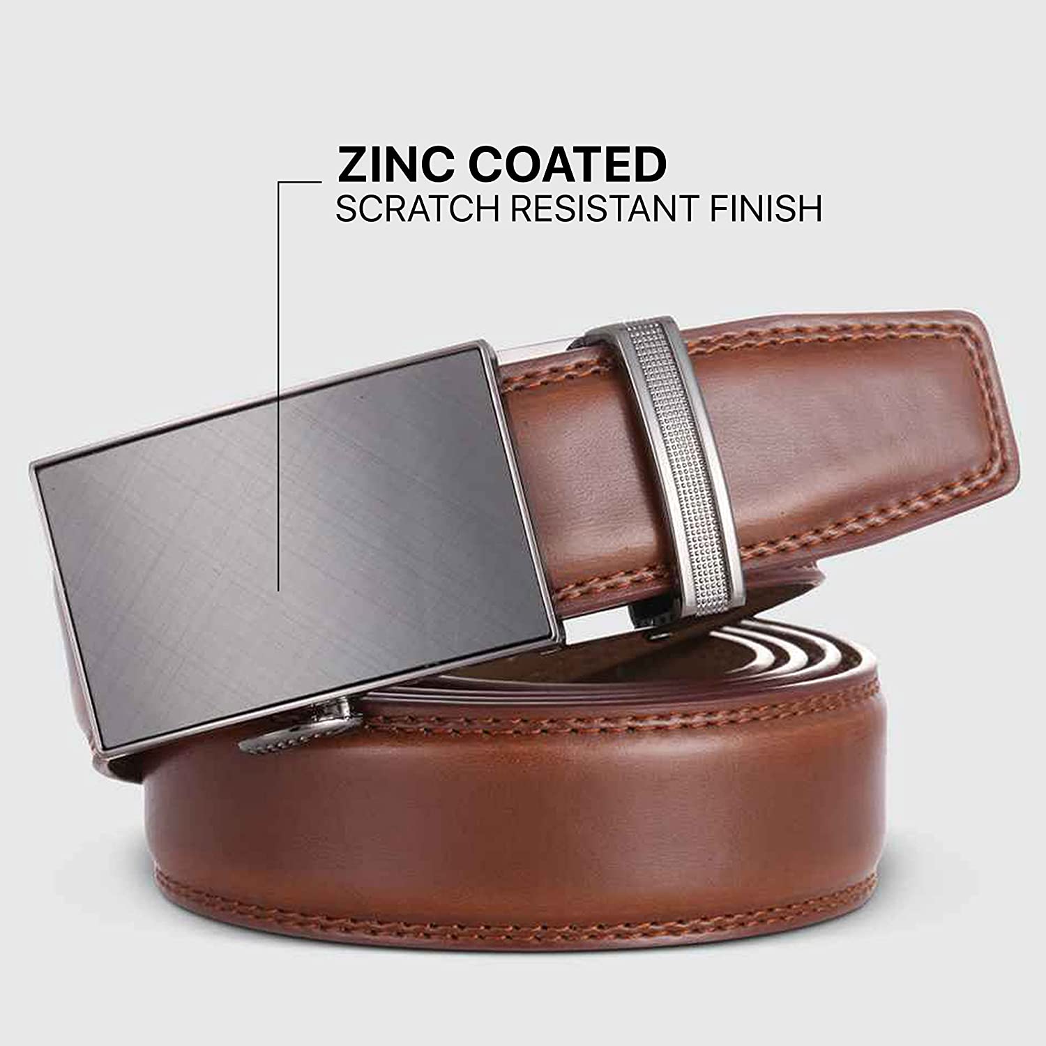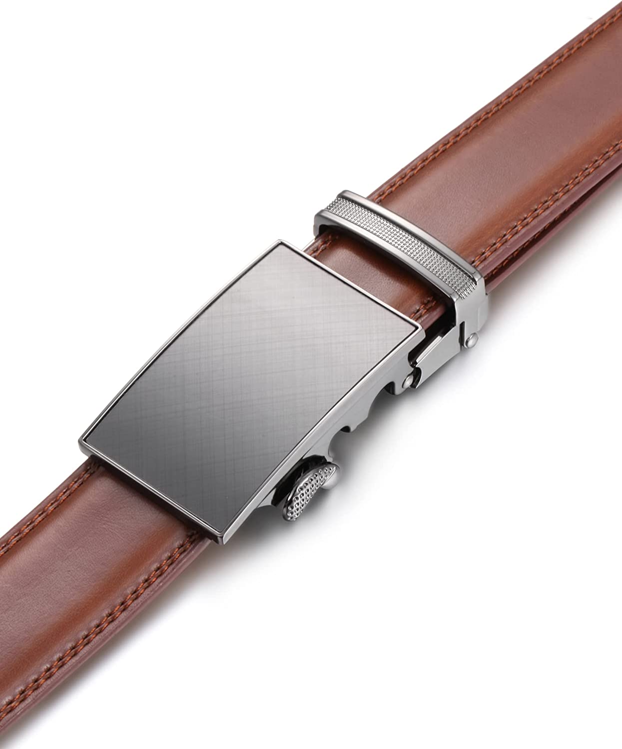 • EASY USE — Just slide the dress belt into the sliding buckle and pull the ratchet belt through, the nice belts buckle simply auto locks the automatic belt, to release the belt, gently push the lever on the side of the removable buckle and lock will snap. Simple, smooth and sleek!