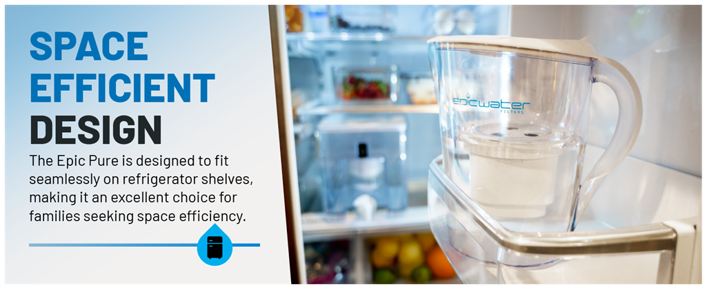 - Filtered water pitcher for refrigerator: This large water filtration pitcher for refrigerator is easy to pour and refill. This space efficient gravity water filter system jug fits perfectly on refrigerator shelves and is great for families. H 10"; W 6"; L 10"; Weight: 2 lbs. This solid carbon block water purifier pitcher with filter will keep your family drinking filtered water for years to come. Rigorously tested against NSF/ANSI standards 42, 53, 401, and P473 (NSF 53 Water Filter)