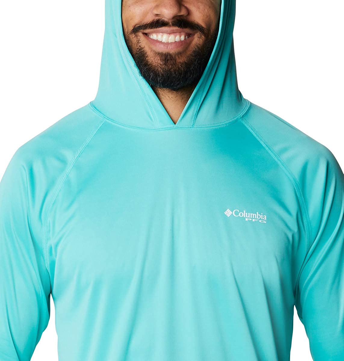 An anglers perfect hoodie: the Columbia PFG Terminal Tackle Hoodie is the ultimate day-out-on-the-boat staple for its quick-drying and sun protection fabric. This hoodie remains lightweight, yet durable, no matter the weather or catch. High quality materials and expert craftsmanship are the backbone of Columbia Men's apparel. The technology featured in this hoodie is necessary for any day out on the water. The exterior layer is made up of a combination of Columbia’s signature protection fabrics: UPF 50 works to block and shield your little one from harmful UVA and UVB sun rays known to cause skin damage; the advanced wicking fabric works to pull moisture away from the skin so sweat can evaporate and you can remain cool. The Columbia Terminal Tackle Hoodie also features subtle style—our signature logo runs along the sleeve and the chest. Columbia offers this fishing hoodie in multiple staple colors and sizes. To ensure the size you choose is right, utilize our sizing chart and the following measurement instructions: For the sleeves, start at the center back of your neck and measure across the shoulder and down to the sleeve. If you come up with a partial number, round up to the next even number. For the chest, measure at the fullest part of the chest, under the armpits and over the shoulder blades, keeping the tape measure firm and level.