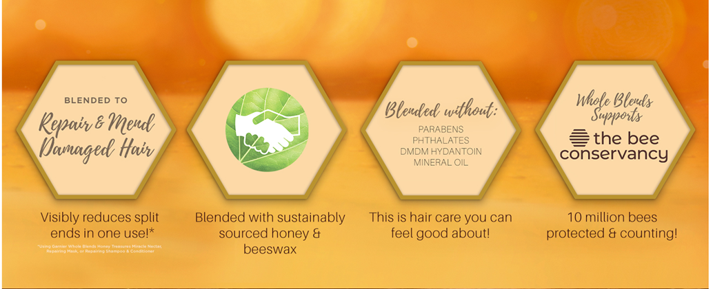 For every blend, there's whole Blends, hair care blended with purpose, because when the right ingRedients come together something beautiful happens, we believe in the power of blends because blended makes us better. Whole Blends Repairing leave-in Miracle nectar h1y treasures treatment provides 10 benefits in 1 treatment and is blended with purpose with h1y known to replenish and royal jelly and propolis known to nourish and repair. 10 benefits including 1 Moisturizes, 2 detangles, 3 repairs and prevents split ends, 4 tames frizz, 5 strengthens hair's fiber, 6 restores softness, 7 nourishes, 8 protects against heat, 9 Reduces breakage, 10 improves manageability. Garnier Whole Blends Miracle nectar 10-in-1 leave-in is blended with purpose with Royal Jelly, h1y, and Propolis extracts to reveal w8lessly nourished, silky hair, restoRed with strength & softness. Miracle nectar h1y treasures treatment is paraben-free, crafted with select ingRedients and unique fragrances, blended with purpose into nurturing, gentle formulas to help restore the natural beauty of hair with every use.
