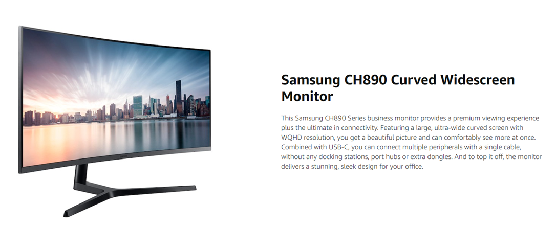The Samsung CH890 34-inch Ultra-Wide Curved Monitor allows you to multitask seamlessly. The monitor's picture-by-picture capabilities let you connect to two different devices at the same time while maintaining original image quality. Connect via HDMI, DisplayPort, or USB Type-C with just one monitor. Increase your ergonomic efficiency with an adjustable stand which can also be mounted on your wall. With 1800R Curvature, get an engrossing view of on-screen content, matching the natural curvature of your eye. Enjoy visual clarity with Ultra WQHD and a screen resolution of 3440x1440, approximately 2.5 times the pixel density of Full HD. See more details at a glance and have a complete view of web pages and documents, all with less scrolling and zooming.